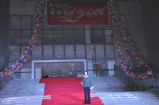 在未央校区AD广场成功举办“真才实学,化茧成蝶” 2012级迎新晚会。出席晚会的有院党委书记张忠老师、院党委副书记张治宏老师、教学院长王正品老师、科研院长坚增运老师和材化学院党委委员、系主任、教研室主任、新生班主任及学院办公室老师、各年级辅导员等。晚会还邀请了快猫