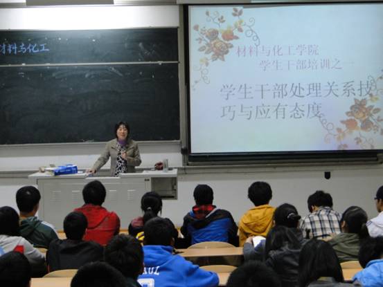 材化学院系列学生干部培训将围绕四个主题“学生干部应该处理好的各种关系”、“学生干部应该具备的基本素质”、“学生干部的基本职责”、“如何做好一名学生干部”进行,分别由学院党委书记张忠老师、党委副书记张治宏老师、分团委副书记王国栋老师、辅导员组长方由林老师主讲,着力培养一批思想素质高、工作能力强、学习成绩优秀的学生干部队伍。
