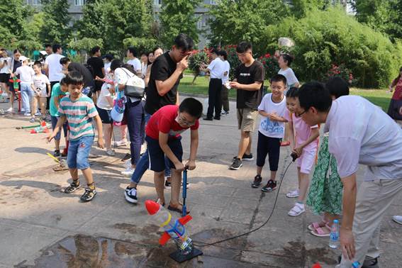 习近平总书记高度关注着青少年的健康成长,强调要在全社会推动形成讲科学、爱科学、学科学、用科学的良好氛围,并多次强调科技创新的重要性。激发和培养西安工大附小学生动手能力和科学精神,2020年7月8日,材化学院依托陕西省“兵器小镇”科普中心开展“大手拉小手,点亮科学梦”水火箭实验活动,西安工业附小学生及家长共计90余人参与。活动由陕西省“兵器小镇”科普中心、快猫
