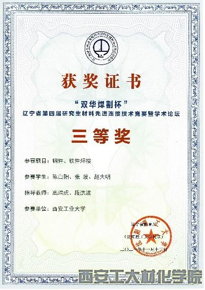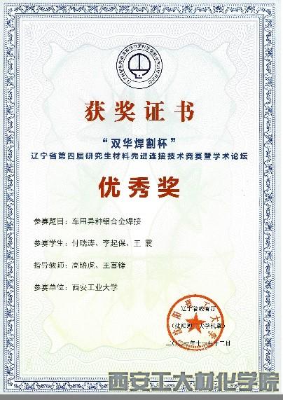 三支参赛队伍全部获奖。其中由杨忠、高培虎指导,研究生党国栋、曾圣聪、金灿共同完成的作品《军用特种车辆(Ti、Cu焊接)》,高培虎、段宏波指导,研究生陈白阳、张波、赵大明共同完成的作品《钢件、铁件焊接》荣获三等奖,高培虎、王喜锋指导,研究生付瑞涛、李起保、王震共同完成的作品《车用异种铝合金焊接》荣获优秀奖。