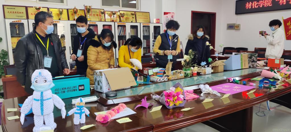 此次“‘材’子抗疫 点亮生活之光”宿舍文化活动包括“‘巧手抗疫,变废为宝’DIY比赛”、“‘防疫在线,全寝出击’宿舍风采展示”、“‘扬抗疫家国情怀,亮新时代青春底色’海报设计比赛”、“与你相‘寓’宿舍生活Vlog比赛”和“‘折出风采 携手抗疫’折纸比赛”五项活动。活动结束,共计收到100余部作品。1月10日下午3时,材化学院党委书记呼晓青、学院党委副书记陈卫星和全体学生辅导员对参赛作品进行了评选。