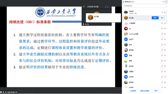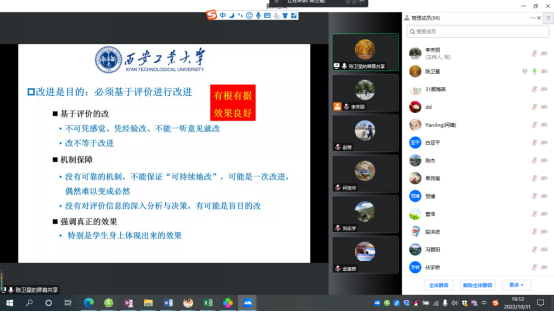 召开了 “过程性考核”的线上分享交流会,会议邀请材化学院党委副书记,陕西省教学名师陈卫星教授作题为“工程教育与过程性考核”的专题报告。学院全体任课教师认真聆听了报告,会议由金洗郎副院长主持。