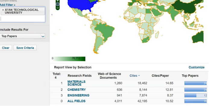 共发表ESI论文4011篇。其中,高影响力论文76篇,高被引论文75篇,热点论文4篇,总被引频次达到42195次。在高被引论文发表数量中,材料科学24篇,化学学科23篇,工程学学科13篇。
