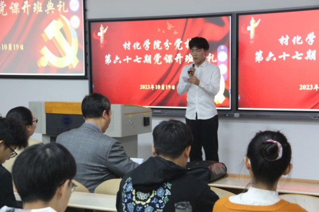 为深入学习贯彻习近平新时代中国特色社会主义思想和党的二十大精神,加强对入党积极分子的培训工作,根据校党委工作安排和党校工作要求,材化学院党委于2023年10月19日下午18:30在教2-106举行入第六十七期党积极分子培训班开班仪式暨第一次授课学院党委副书记陈卫星参加会议。