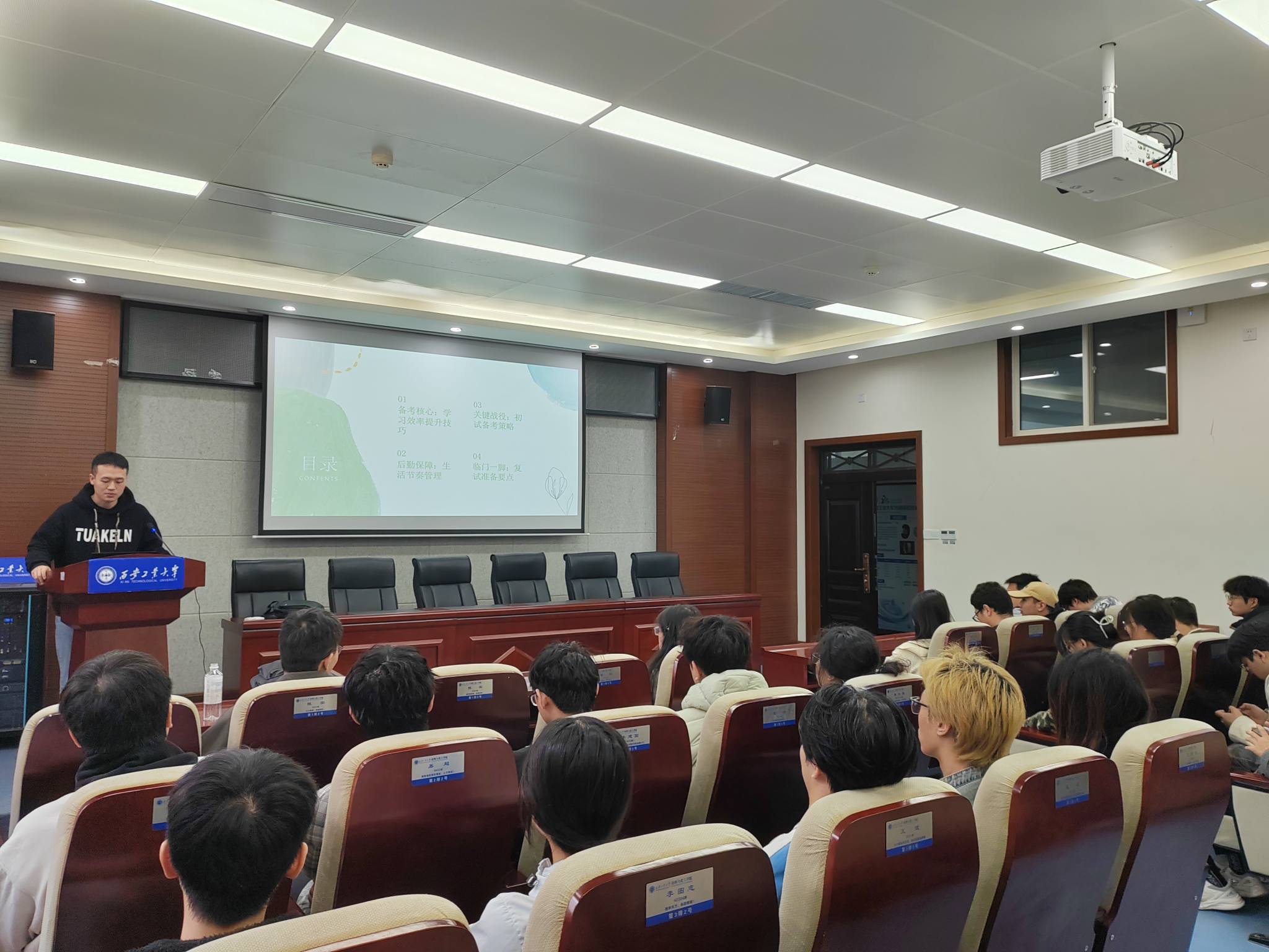 交流会伊始,辅导员张瑞红老师分析了近年来的考研形势,鼓励同学们充分利用学院提供的资源和学长学姐们的宝贵经验,积极备考。在经验分享环节,三位已成功考取本院研究生的优秀学长学姐结合自身经历,进行了各有侧重的分享。高斯翔学长系统性地从政治、数学、英语、专业课四个核心科目入手,分享了不同科目的复习时间安排、主流辅导资料的选择以及应对各类题型的技巧。罗霄楠学姐则从备考建议、考前准备、心态调整等方面详细讲述,强调了备考过程中目标分解与计划执行的重要性。刘李欢学长的分享侧重于备考建议与生活节奏的平衡。他结合自身经历,真诚地讲述了如何合理安排每日学习时间,保证充足休息与适度锻炼。在答疑环节,现场气氛热烈。同学们就自己关心的具体问题,如专业课复习重点、公共课学习方法、复试流程与准备等问题踊跃提问,三位学长耐心地给予了详细解答。