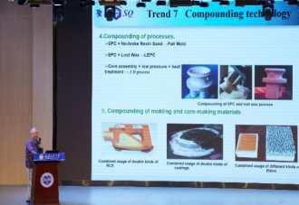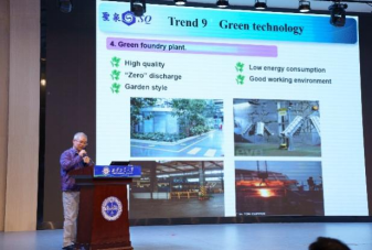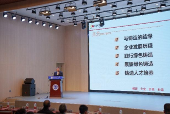 第一位主讲人熊鹰(“中国铸造杰出贡献奖”获得者、重庆长江造型材料(集团)股份有限公司董事长)以【成功之路:坚定践行绿色铸造】为主题,结合自己学习材料专业和企业发展成长过程介绍铸造用先进造型材料、3D打印装备材料及其发展方向、世界首创的高效节能新型铸造废旧砂再生处理设备系统。