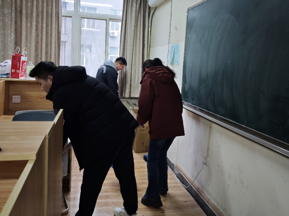 针对自习室存在的“桌面涂鸦痕迹”、“地面散落零食碎渣”及“座椅摆放无序”等问题,活动当日,志愿者们配备了清洁抹布、静电拖把等专业装备,对自习室展开了全面清扫,令其焕然一新。他们从一桌一椅的细微之处着手,让“党员红”的色彩成为自习室中最温馨的背景色。”