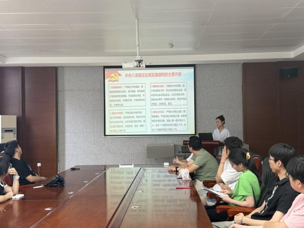 学习会上,纪律委员魏艳婷围绕中央八项规定的主要内容、实践意义、时代价值与制度创新四个维度展开讲解,结合研究生学习生活实际,重点解析中央八项规定对改进学术作风、精简科研活动等方面的现实指导意义,并引导党员结合自身经历,就“如何在日常学习生活中贯彻落实中央八项规定精神”展开心得交流。