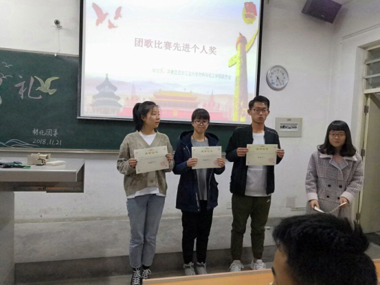 团委于2018年11月20日在教三-205举办团歌比赛颁奖典礼。参加本次颁奖典礼的为材料与化工学院团委副书记甄子清、团委副书记尹相伟、团委全体成员与参与团歌比赛全体人员。