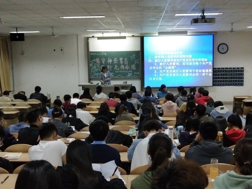 党课开始,任老师首先对入党誓词的起源及发展进行讲解,让同学们了解不同历史时期誓言所传达的历史意义。紧接着,任老师强调,入党誓词是共产党员的人生信仰、行为准则,并要求同学们学习以习近平总书记为代表的常委会成员手按宪法宣誓的伟大精神。随后,任老师用实际例子告诉每一位同学,作为一名党员,要树立坚定的理想信念,为社会做出自己的贡献。通过老师细致的讲解,大家深刻认识到共产党员要全心全意为人民服务,忠于党,忠于人民。最后,在任老师的带领下,同学们朗读入党誓词,使得大家加入中国共产党的决心更加坚定。至此,本次党课圆满结束。