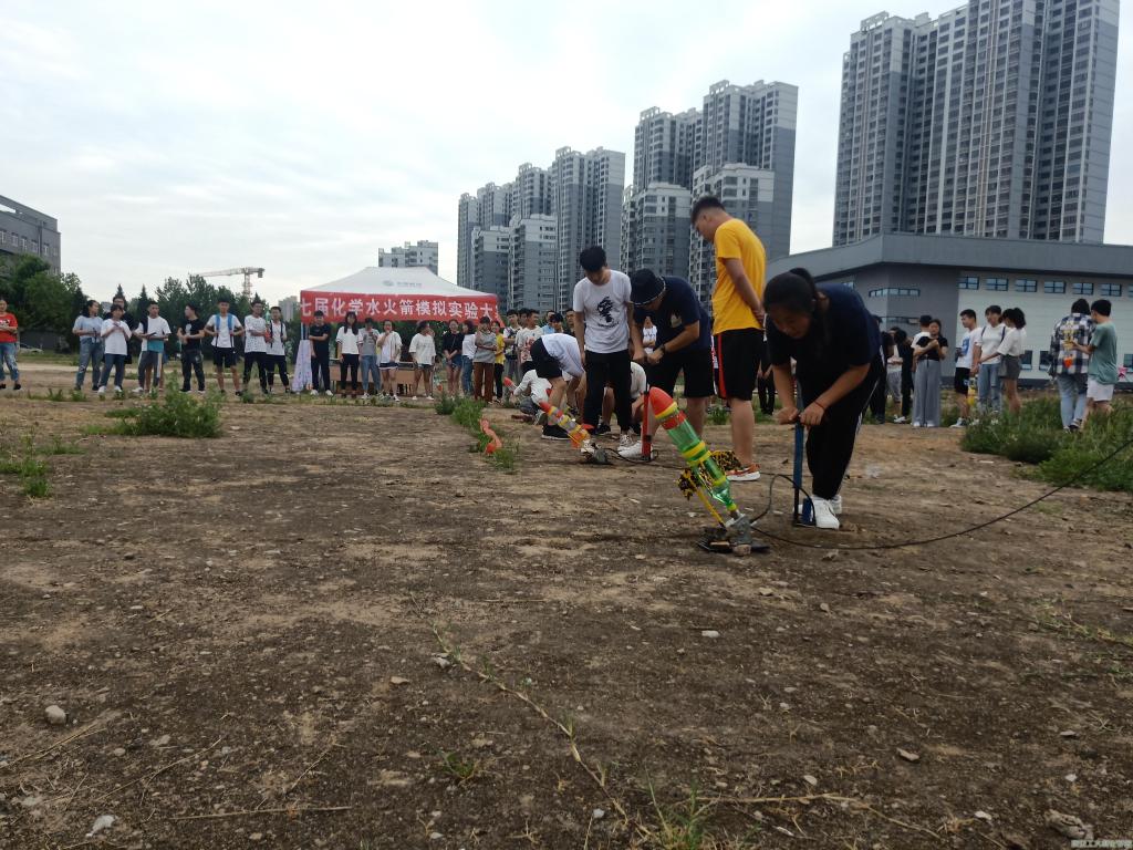 未央校区篮球场旁西边空地举办以“建国七十,中华腾飞”为主题的化学水火箭大赛。科协全体工作人员及参赛选手参与此次大赛。