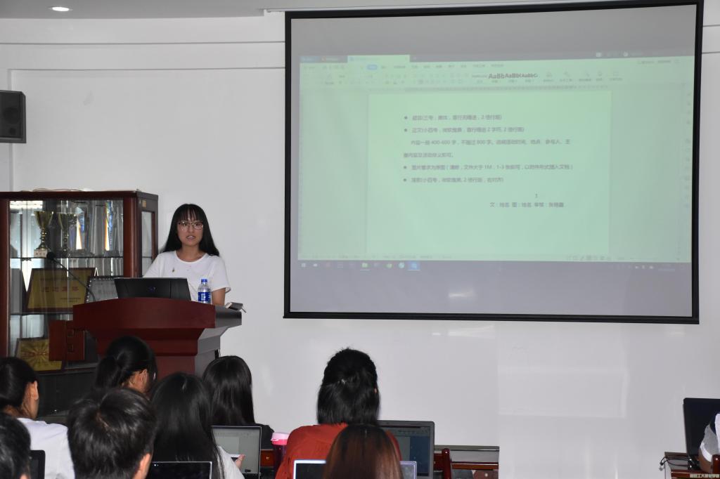 本次培训会由学生会副主席张思雨主持召开,她指出本次培训会旨在提高团学干部对通讯稿的重视度,加强干部使用办公软件的熟练度,为今后的工作打下扎实基础。其次,学生会副主席车枭向团学干部展示World文档处理的各项功能,并对World一些常用功能的操作进行详细的讲解,还一一解答了干部们提出的相关问题,让每一位团学干部都熟悉掌握Word办公时的具体功能和操作。最后,学生会副主席张思雨对通讯稿的写作格式做出具体要求,包括字体、字号、排版等,并结合不同类型的通讯稿范文分层次地、细致入微地介绍了通讯稿的写作要求、注意事项及常见错误。并强调学生工作虽然繁重,但学生干部们应始终将“全心全意为学生服务”的宗旨牢记于心,尽职尽责,为学院更好发展贡献自己的青春力量。