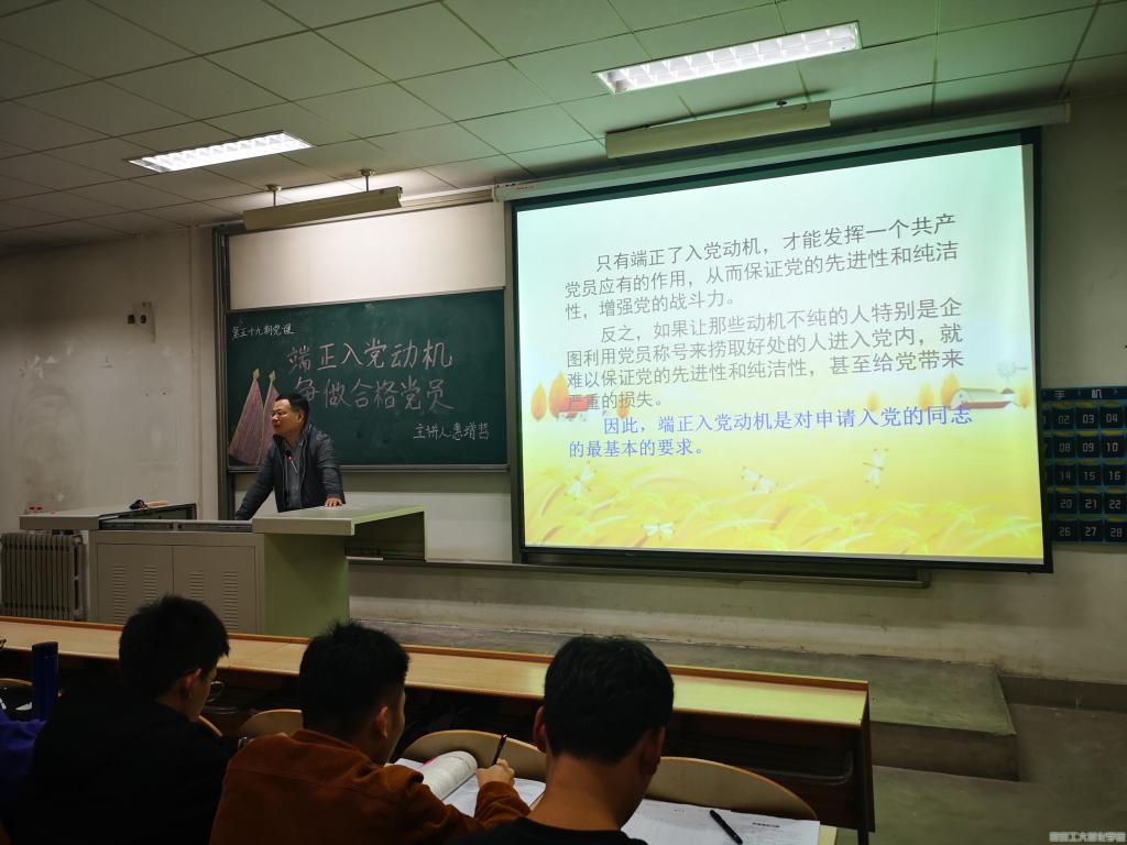 为加强对入党积极分子的教育并传授党的基本思想,端正学生入党动机,材化学院于2019年10月17日晚19:30在教2—212顺利开展第五十九期党课。本次党课主讲人为学院党委书记惠增哲,全体党课学员参加。