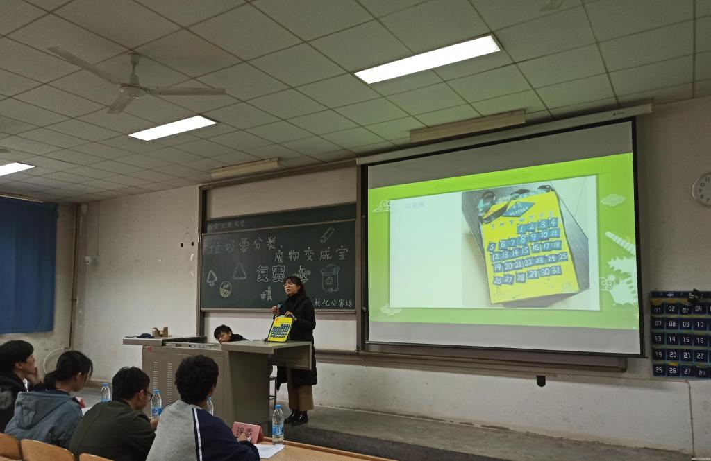 团委吴若愚和史林烨的主持下正式开始。首先由主持人介绍本次活动的宗旨即“垃圾分类,变废为宝”,紧接着进入比赛第一环节“变废为宝创意赛”,在机电工程学院青协副书记周迪迪宣读比赛规则后,参赛选手依次有序上台讲解自己团队的成果,每位选手的作品都极具创意,包含着积极向上的价值与意义。随后比赛到达第二环节“垃圾分类小达人”,由快猫