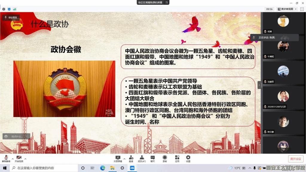 会议伊始,学生干部陈源为大家介绍了政协会徽的样式及其代表意义,并详细讲解了中国人民政治协商会议的组成部分和主要职能:政协由全国委员会和地方委员会组成,其主要职能为政治协商、民主监督、参政议政。随后,学生干部陈源详细讲解了全国政协第十三届第五次会议内容,并组织全体成员进行学习心得分享。会议最后,学生干部杨静表示,作为新时代青年,我们应当汲取政协会议的精神力量,强化使命担当,从自身做起,积极参加志愿服务,为建设社会主义现代化国家贡献出自己的青春力量。