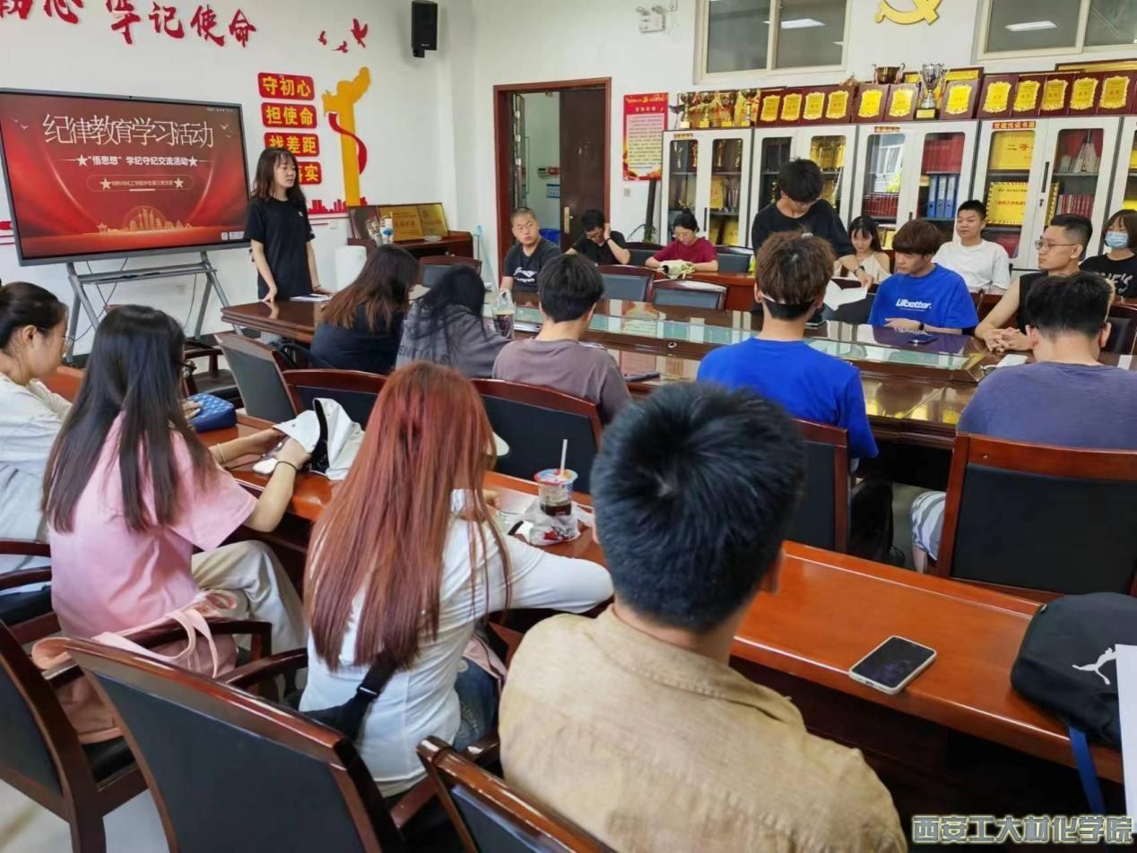 活动开始,首先以集体学习的形式播放《纪检监察干部说纪》系列视频,促使全体党员对党纪条规全面理解、准确领会、把握真谛,让纪律规矩意识成为常态,严格执行各项规定,主动作为,发扬务实廉洁的工作作风。视频列举多个案例,引起了支部党员们的深思,支部书记段强强调,作为学生党员,要从这些反面典型案件中吸取教训、深刻反思,时刻警醒自己,信任不能代替监督,要知敬畏、存戒惧、守底线,时刻对照警醒,高悬规矩戒尺,用党规党纪规范自己的一言一行,用实际行动彰显新时代学生党员的担当。活动中,支部党员踊跃发言交流,表示会坚定理想信念,净化思想品德,把遵规守纪作为立身处世之本。