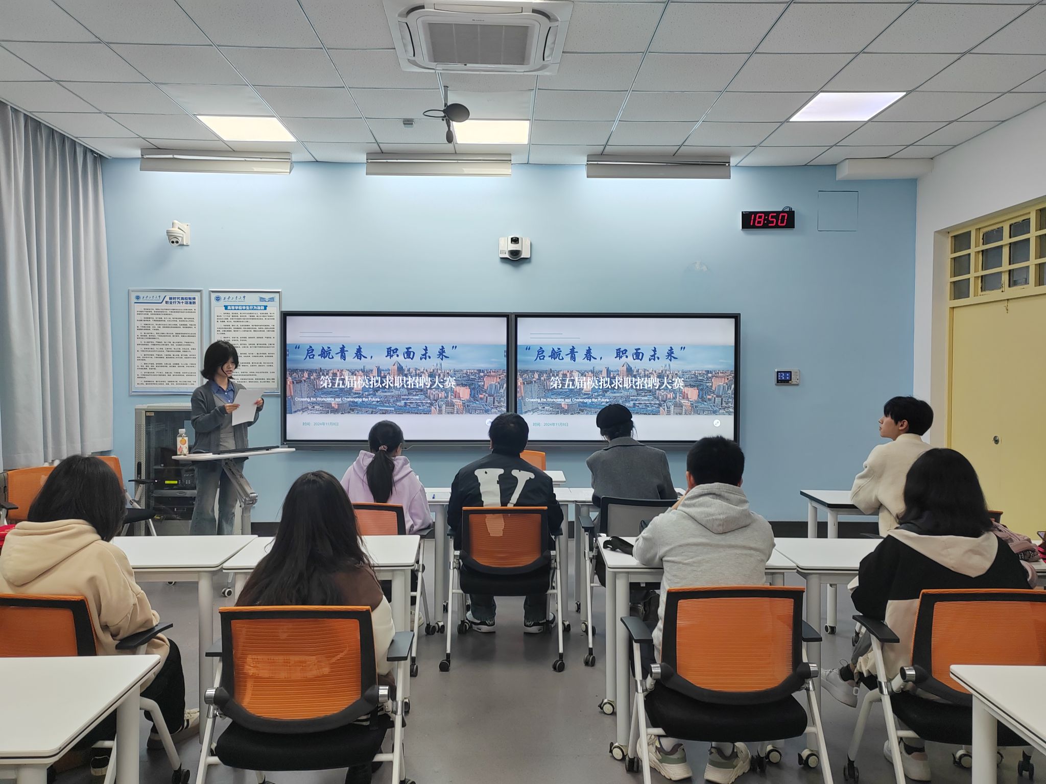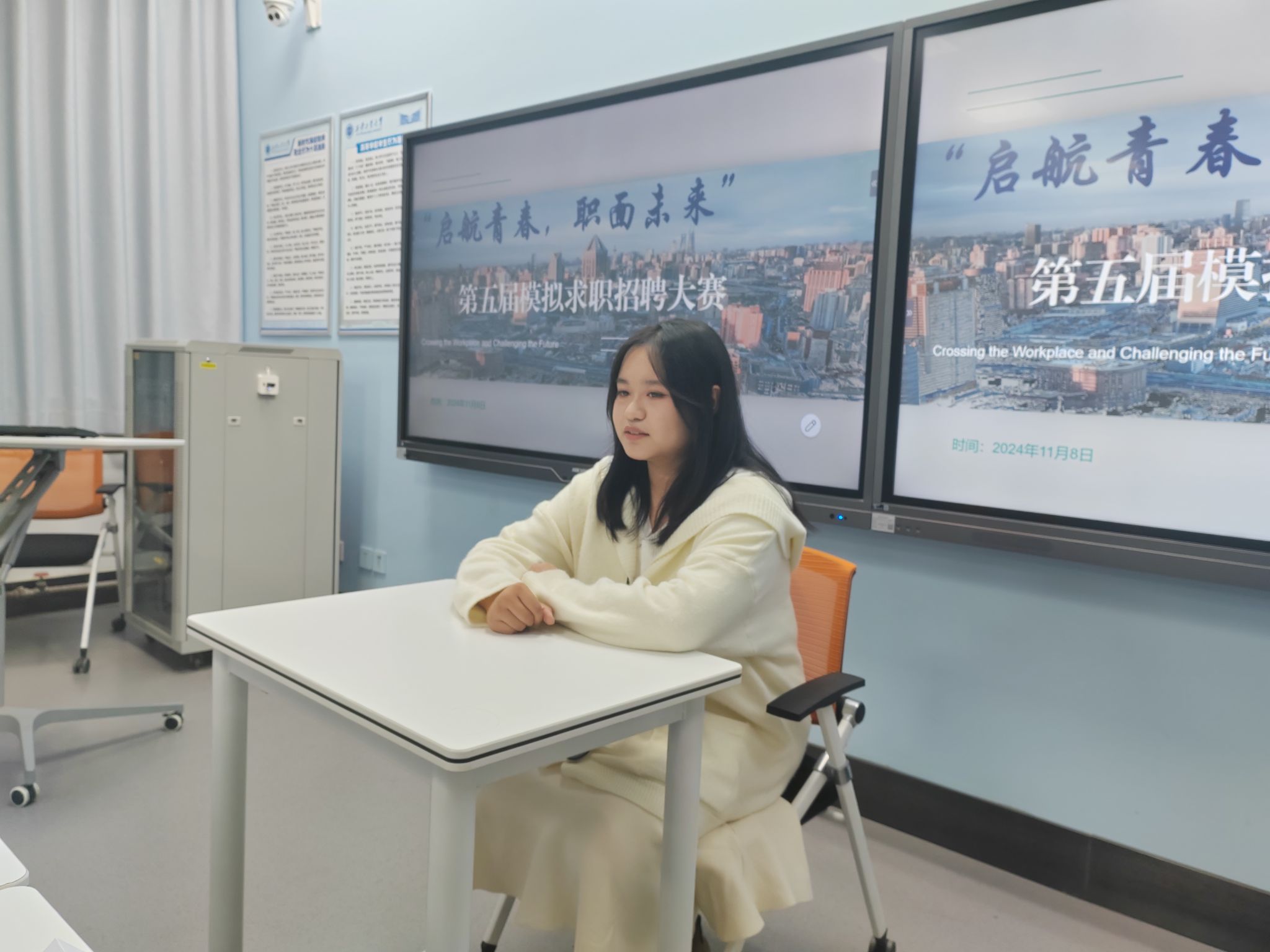 社交与礼仪协会于教3-104举办“启航青春,职面未来”第五届模拟求职大赛。50余名学生参加。