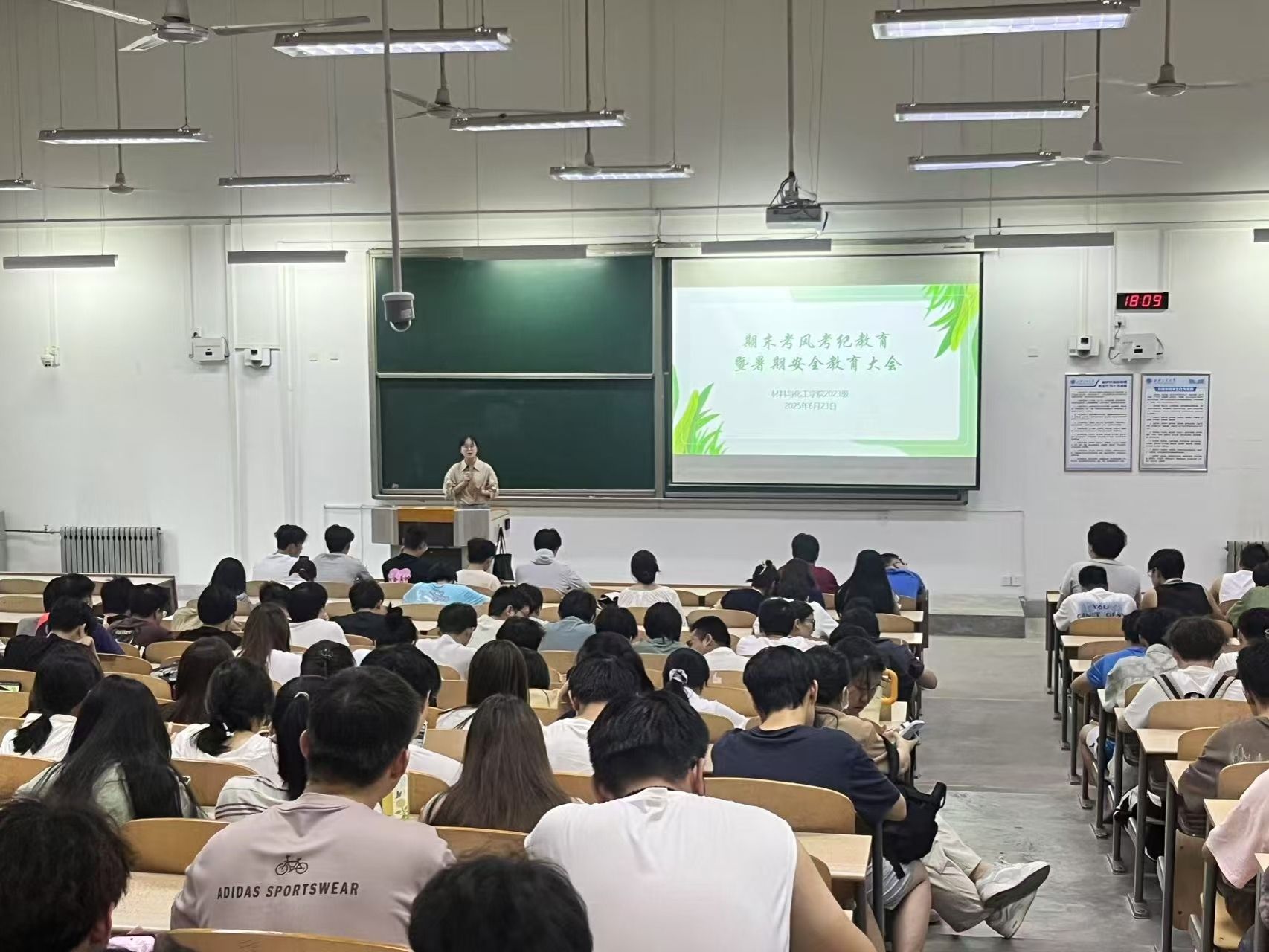 于教1-205召开期末考风考纪教育暨暑期安全教育大会。辅导员乔娜以及全体2023级学生共同参与此次大会。