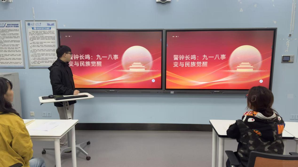 会议伊始,学生干部高淼阳以“历史脉络+核心逻辑”双轨模式展开讲解。他先通过时间轴清晰梳理了九一八事变的起因、经过及对中国近代史的深远影响,结合历史图片、文献节选等史料,还原了1931年东北沦陷的屈辱历程;随后深入剖析“民族觉醒”的核心内涵,指出事变不仅是国难开端,更唤醒了全民族的抗争意识,为后续全民族抗战奠定了思想基础。清晰的讲解让在场成员快速建立起对主题的系统性认知,也激发了大家探究历史细节、感悟精神内涵的兴趣。