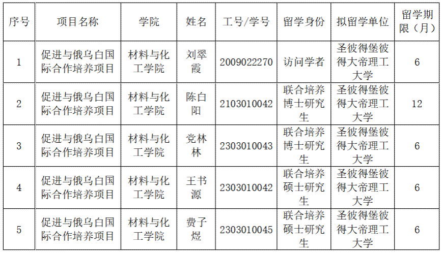 根据国家留学基金委2024年促进与俄乌白国际合作培养项目要求,快猫 于2024年9月启动第二批促进与俄乌白国际合作培养项目院内遴选工作。经个人申请、导师推荐、学院和学校审核,确定5名候选人,现予以公示。公示时间:2024年9月2日至2024年9月6日。