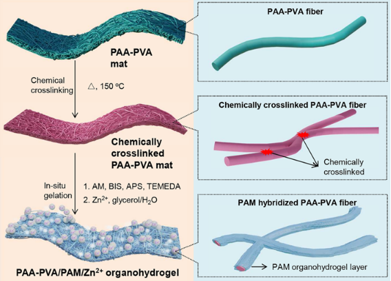 论文通过“静电纺丝-热交联-原位凝胶化-溶剂交换”的策略制备出多尺度PAA-PVA/PAM/Zn2+有机水凝胶。这种有机-水凝胶可作为柔性力学传感器中的力-电转换材料和锌离子混合超级电容器中的电解质,赋予柔性电子器件在宽温度范围和恶劣机械条件下正常工作的能力。本工作不仅为改善凝胶材料的力学性能提供了新思路,而且为柔性电子器件的研究与应用提供了有前景的基础材料。