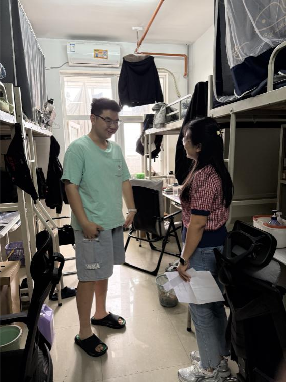 走访中,辅导员始终将安全放在首位,重点排查宿舍卫生与消防安全,检查地面整洁度、物品摆放情况,对卫生欠佳宿舍现场指导整改。另外,重点排查违规电器、电路安全及消防设施,切实消除安全风险。同时与学生暖心交流,既关切新生住宿、饮食适应情况并指导校园生活操作,了解老生假期动态与学业困惑,对家庭经济困难及重点关注学生给予重点帮扶。此外引导学生调整思想状态,缓解新生迷茫与老生就业焦虑,鼓励学生积极参与学科竞赛,有效激发学生参与热情。