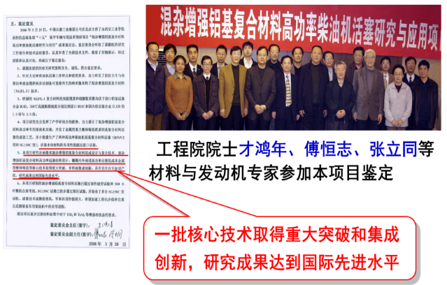 1)攻克了长期制约颗粒增强铝基和镁基复合材料制造与应用的重大技术难题,拥有自主知识产权的铝基复合材料活塞综合性能超过标志国际先进水平的德国活塞,完全取代进口,大量装备于先进国防重点装备(99A主战坦克、05两栖装甲突击车、155 自行火炮等)和先进民用柴油机关键部件中,结束我国重点装备柴油机心脏部件长期依赖进口的历史。参加国庆60周年以来的历次盛大阅兵,受到军委的表彰。