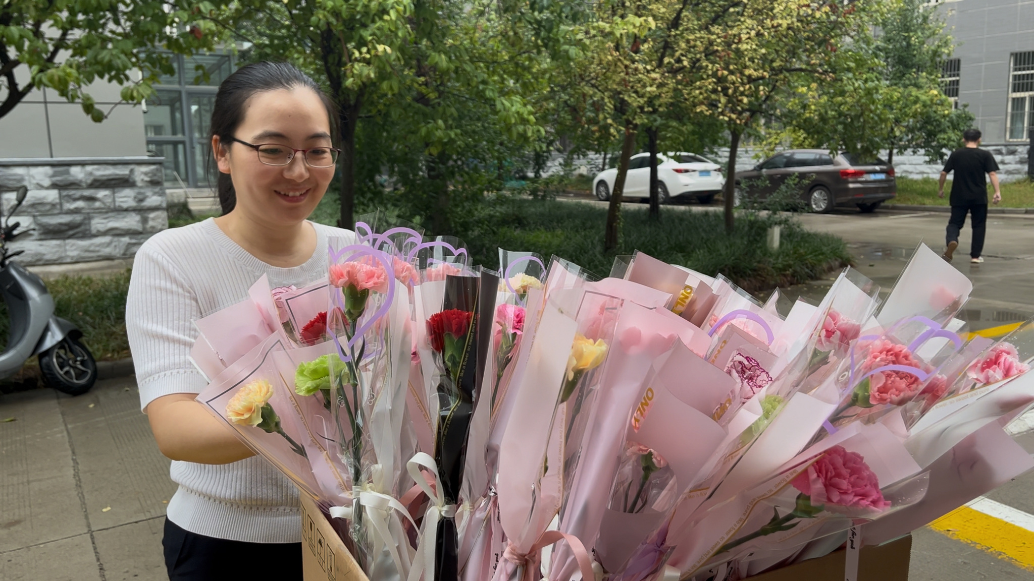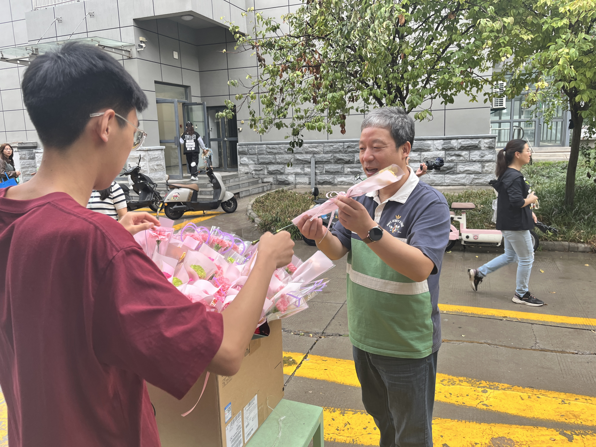随着老师们陆续走进校园,活动正式拉开帷幕。“老师,您辛苦了!祝您教师节快乐!”学生代表双手捧着鲜花,笑容真挚地迎向刚走进教学楼的老师;工会工作人员则为每一位路过办公室门口的老师递上花束与节日祝福。“老师,这是学院给您的节日礼物,感谢您一直以来的辛勤付出!”一声声亲切的问候、一句句真诚的祝福,伴随着康乃馨的淡淡馨香,瞬间温暖了整个学院。