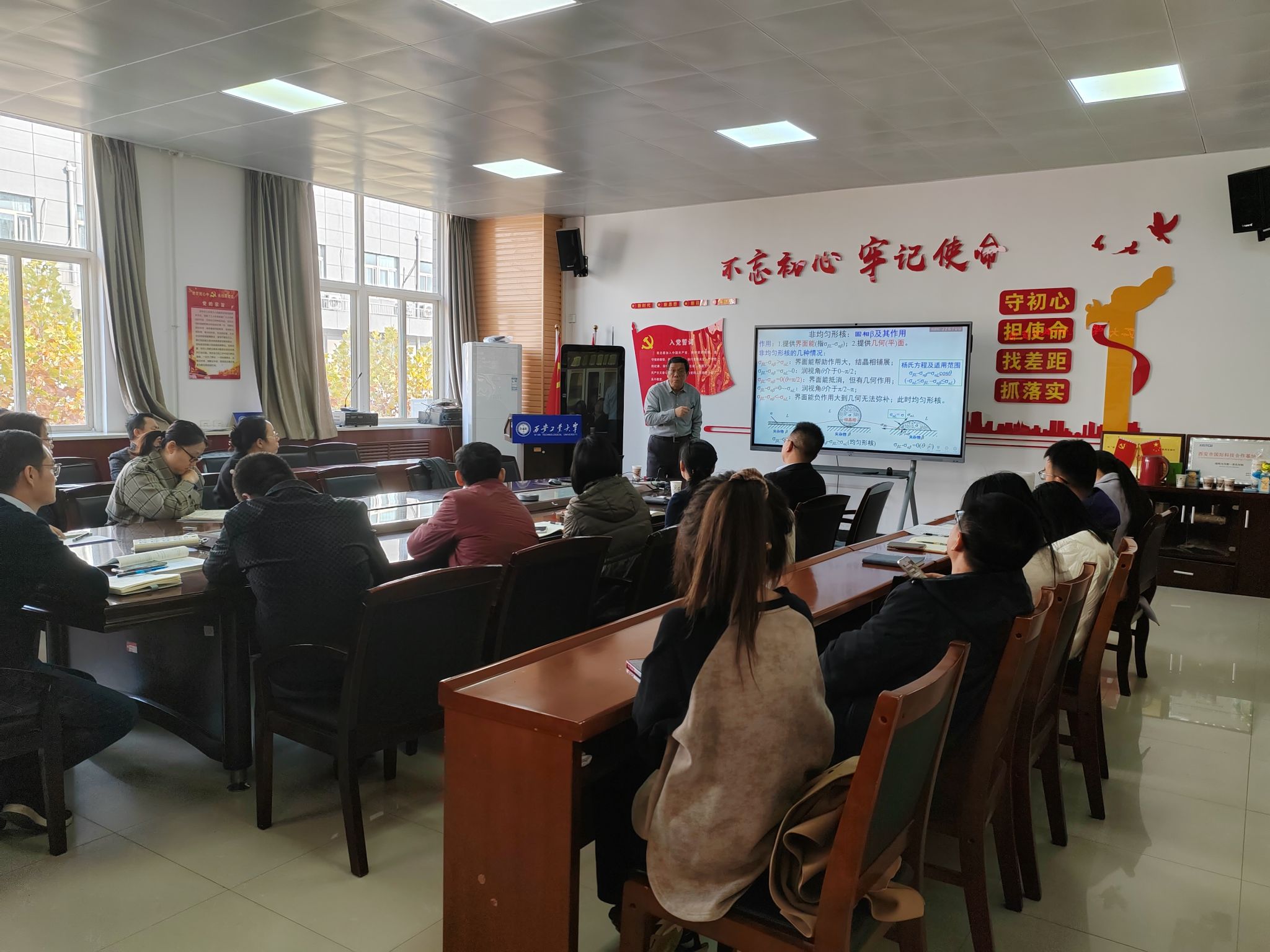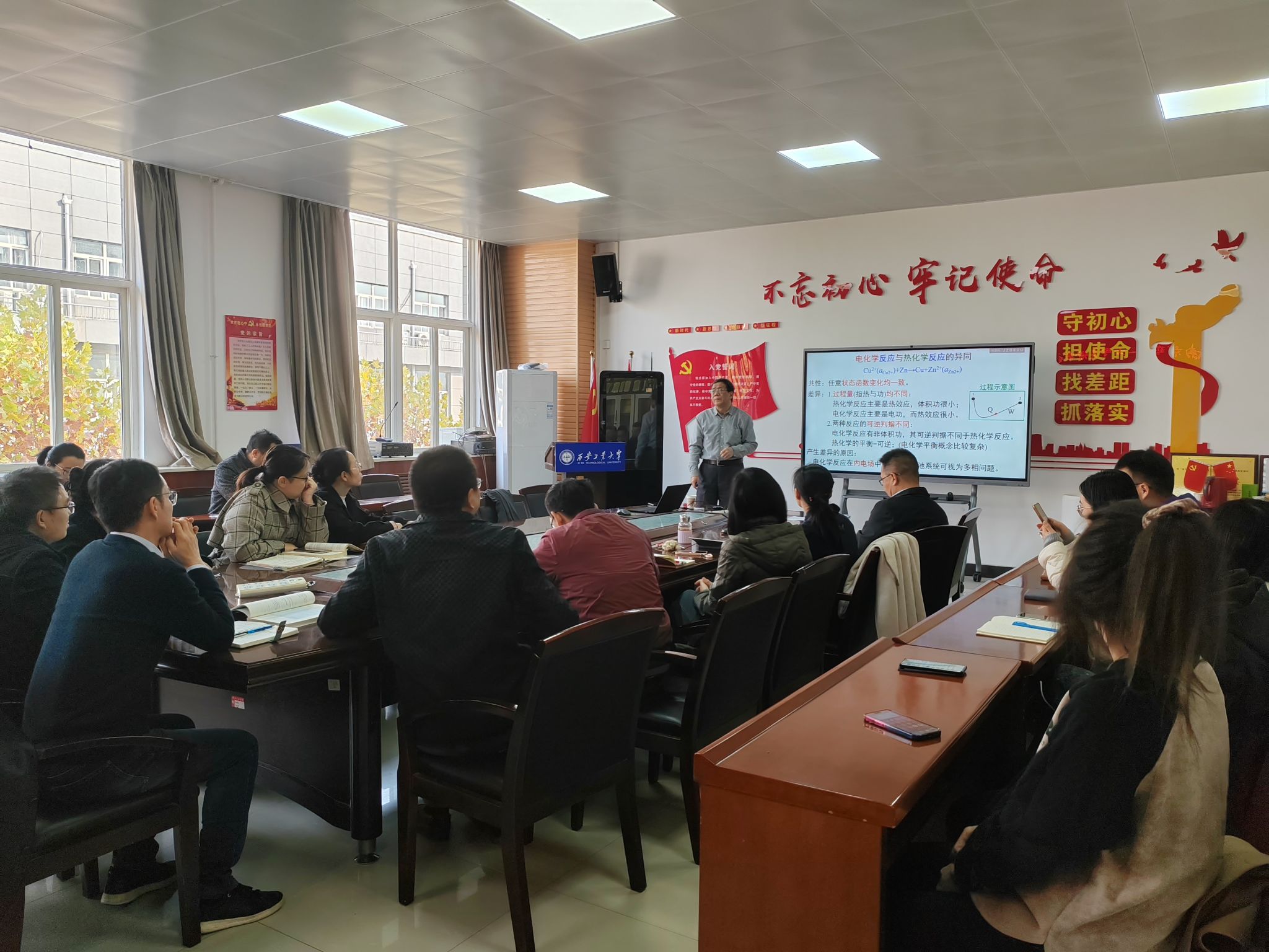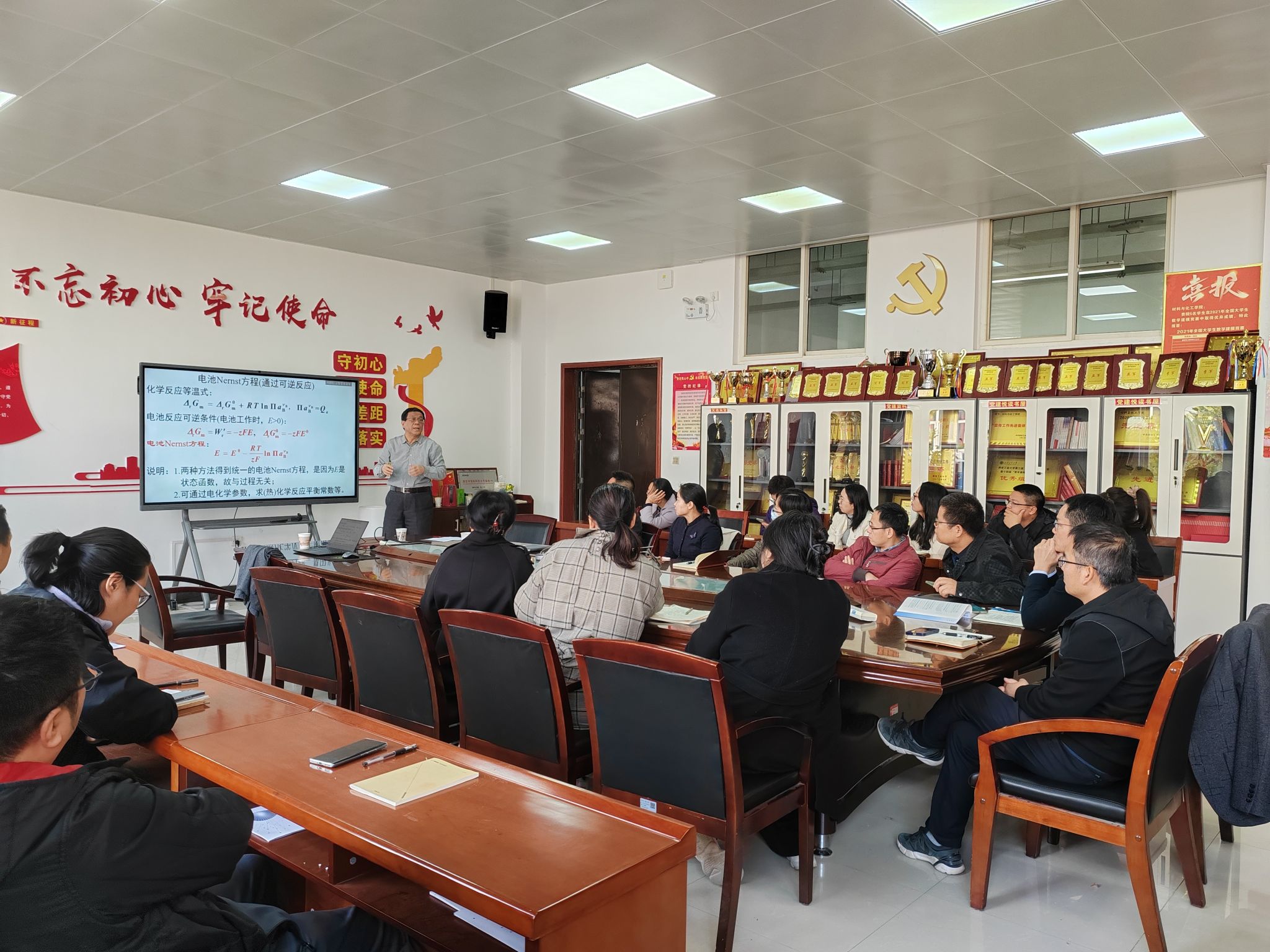 在示范教学讲座中,吴锵教授针对《物理化学》课程课时少、内容较散的问题,提出教师授课中应做到条理清晰,主线突出。讲座中,吴教授讲解了电化学反应与热化学反应的共性和差异,通过内电场与电极电势产生的原因,利用电极反应平衡的电化学势条件推导了电极Nernst方程,突出了热力学与电化学的联系。之后,吴教授以《材料科学基础》中铁碳相图讲解为例,强调了相与组织之间的区别和联系,讲解了均匀形核和为均匀形核的区别,应变能之间的关系和位错应力的特点。